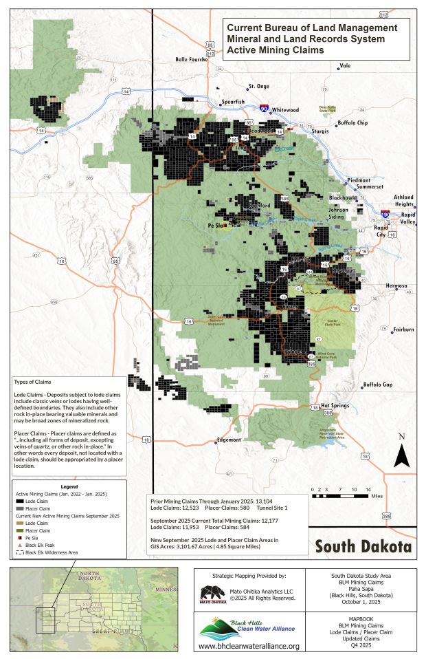 Our updated mining claims map shows there are 259,014 acres currently under active mining claims, or about 17% of the entire Black Hills as of September, 2025. View this map, and all our maps, by clicking HERE.
