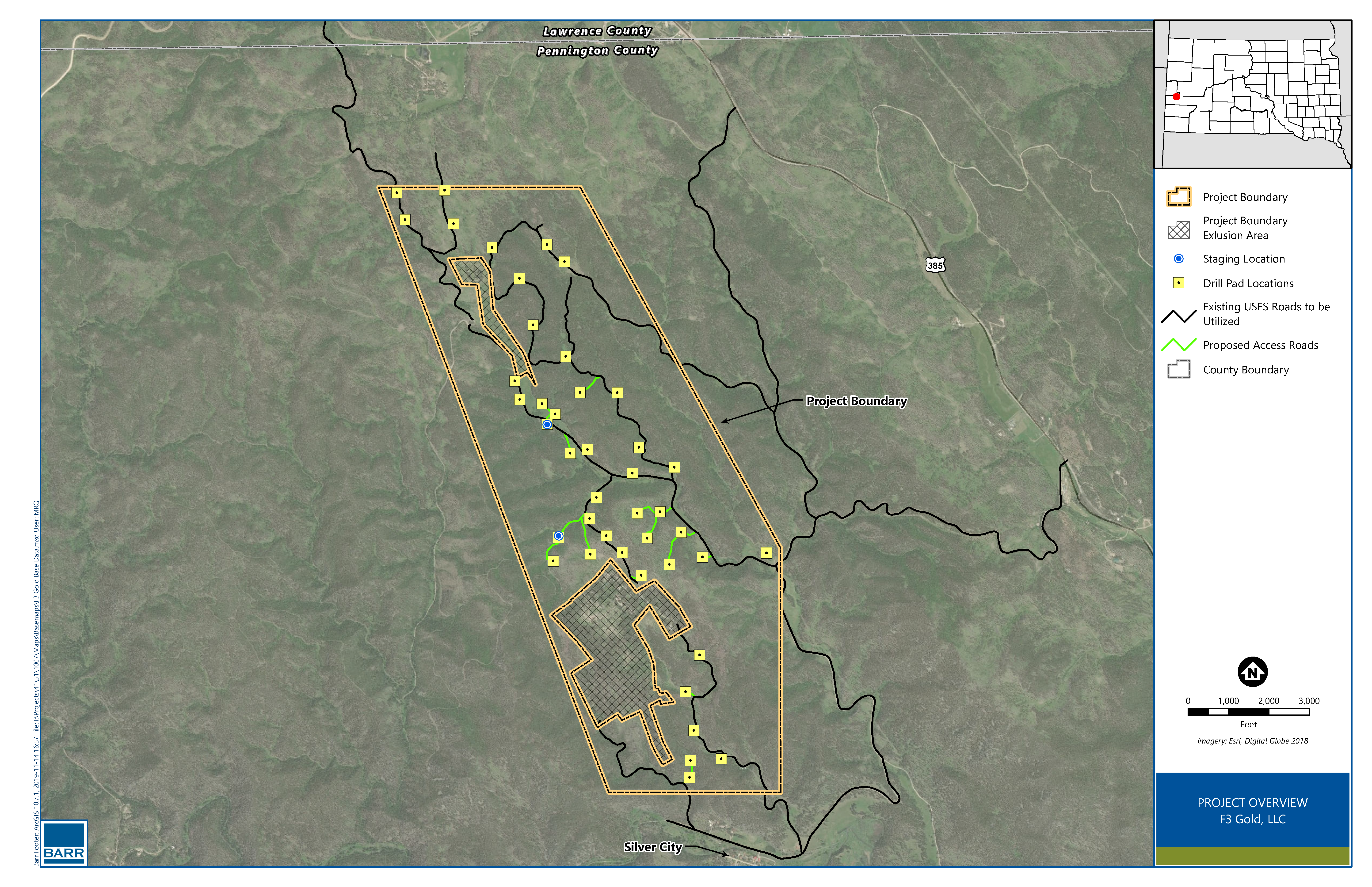 F3 is proposing the Jenny Gulch Exploration Drilling project. The project involves exploratory drilling in up to 42 locations north of Silver City, Pennington County, South Dakota in Sections 19, 30, 31, T2N R5E and Sections 13, 14, 24, 25, T2N R4E.
