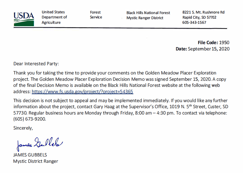 This is the Decision Memo from James Gubbels, the Forest Service’s District Ranger for the Mystic Ranger District, about the Golden Meadows gold exploration project near Rockerville. According to the Forest Service, the project can move ahead. Besides reading this document to find out why, you can read all of our comments and the Forest Service’s replies. Reading this is a good way to see how the Forest Service looks at things and the issues it considers — and ignores.