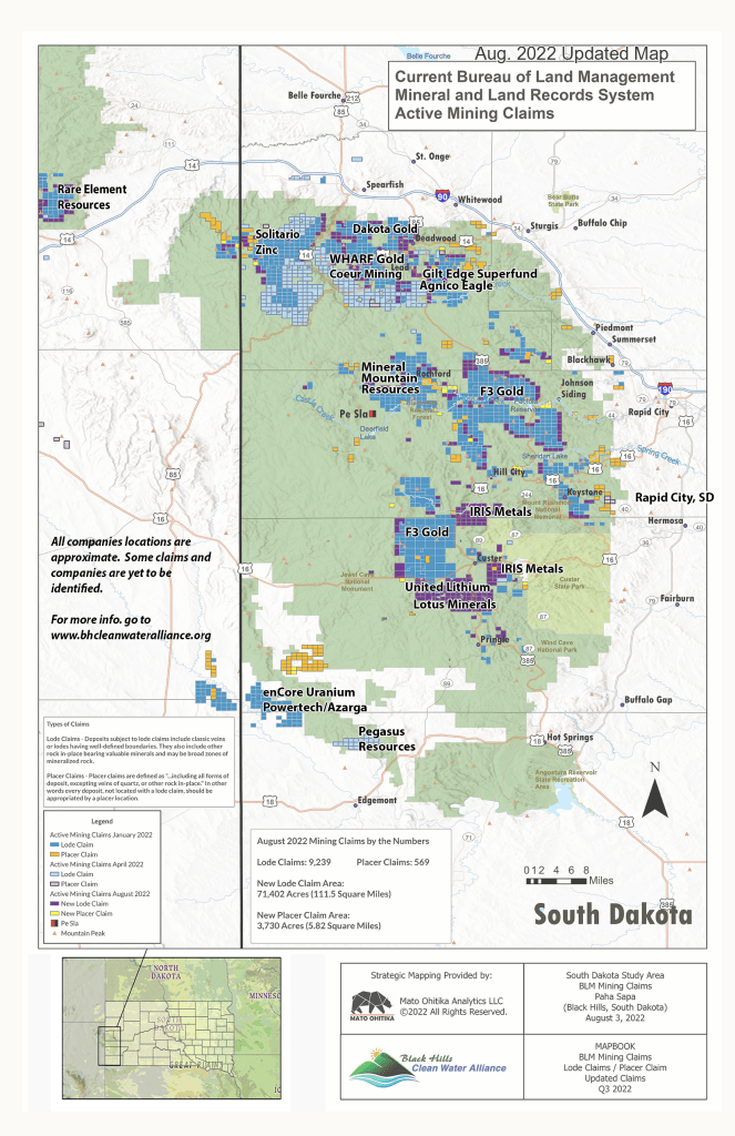 Here is an updated mining claims map for the Black Hills. Claims that are new since April are in purple. Most of these are the lithium mining claims around Custer and north towards Hill City. This updated map shows that there are now over 202,000 acres of mining claims in the Black Hills as of August 3, 2022. This is over 16% of the total Black Hills.