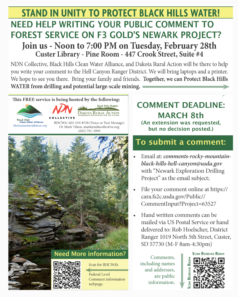 NDN Collective, Black Hills Clean Water Alliance, and Dakota Rural Action will be in Custer to help people write their comment to the Hell Canyon Ranger District. We will bring laptops and a printer. We hope to see you there. Bring your family and friends.