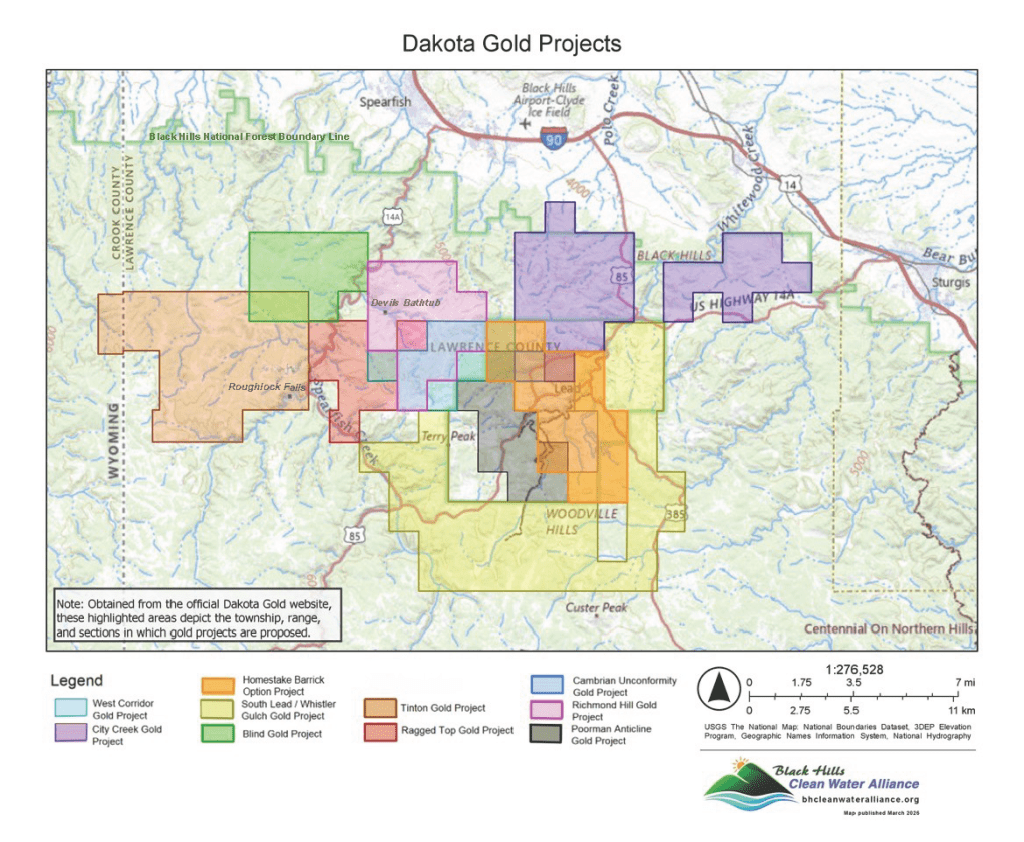 Black Hills Clean Water Alliance did a little research on Dakota Gold’s activities – very little, as we created the map below from information on the company’s website. There, they list their ten projects in the northern Black Hills, including the projects’ locations. We mapped those locations, and the map shows where the company said each of their projects is located. In short, if you aren’t alarmed, you aren’t paying attention. Their projects stretch from just across the Wyoming line to a few miles west of Sturgis, and from south of Spearfish to just north of Custer Peak.