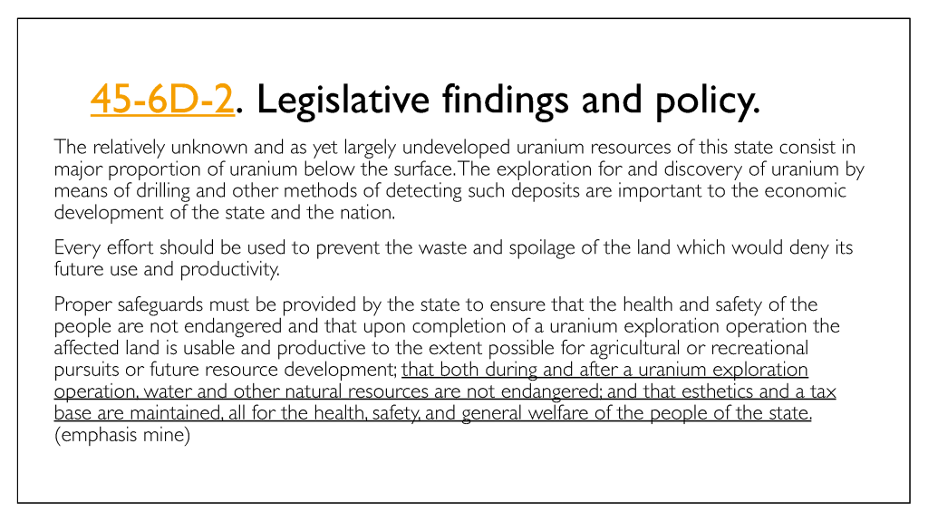 Following are important documents you can review: Notice of Intent from the state, a fact sheet on the state land piece of this project, and the state law that describes on what grounds uranium exploration permits may be denied.
