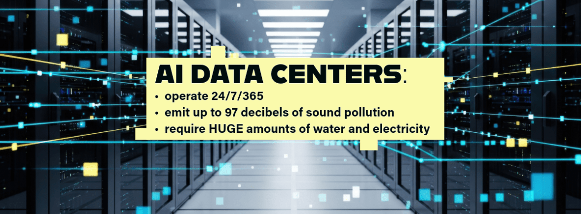 FACT: Data centers operate 24/7/365. They emit up to 97 decibels of sound pollution, enough to cause permanent hearing loss for people who work or live nearby. People who live near data centers report that the light they emit can easily be seen for miles. This disrupts sleep. Data centers generate lots of electronics waste and pollute the air.