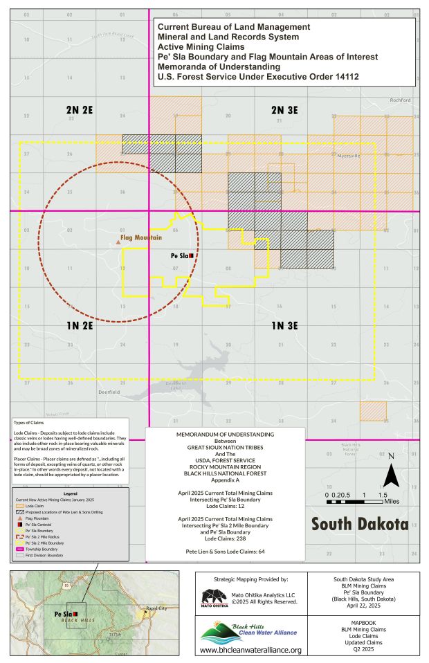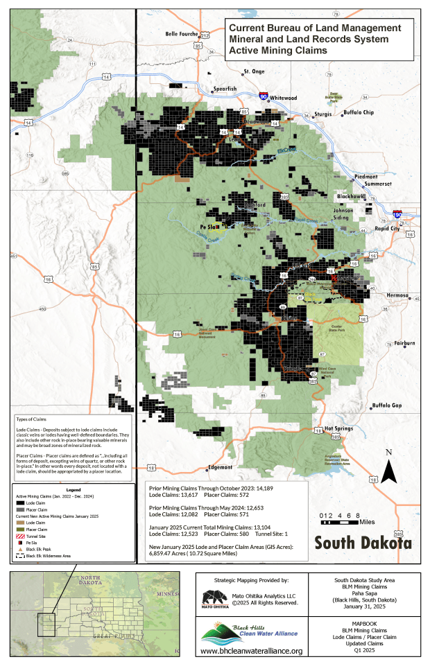 There is now a new active mining claims map for the Black Hills as of January 2025. It shows about 271,000 acres of claims — about a 3.5% growth from the last map in May 2024. The new claims are located primarily in the far northwestern Black Hills, east of Keystone, and just northeast of the existing Dewey-Burdock uranium claims in Custer County (south of Jewel Cave National Park). The new map also shows that some active claims intrude into the boundaries of Pe’ Sla in the central Hills.