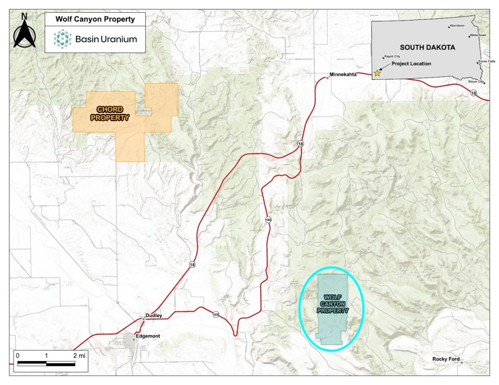 The Wolf Canyon project is located 10 miles east of Edgemont, South Dakota and accessible via US Highway 18. The project is located 8 miles to the southeast of the Chord project