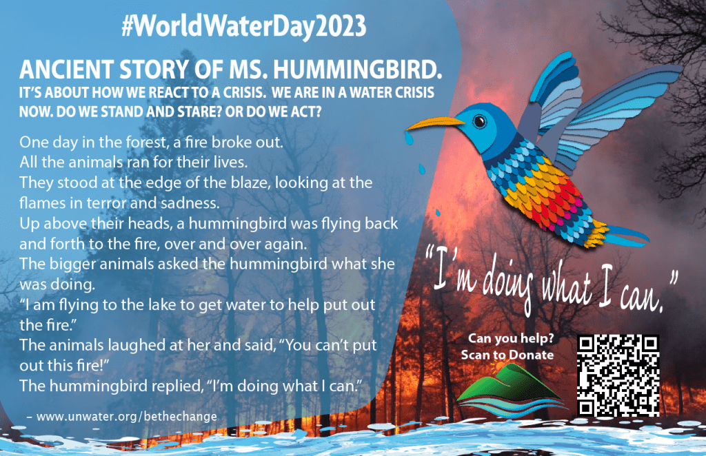 This event is a Wateca Challenge encouraged event to help protect water and prevent single use waste. If you would like to help, please consider bringing your own reusable eating utensils and water bottle/mug. We all need to do what we can like Ms. Hummingbird.